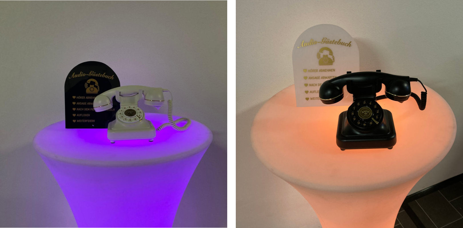 Mieten Sie sich zusätzlich für 19,00€ unseren LED-Bistrotisch als idealen dekorativen Eyecatcher zur Präsentation unseres Audio-Gästebuches.